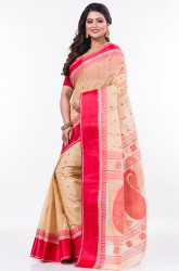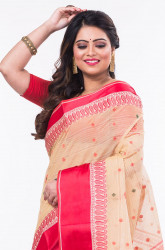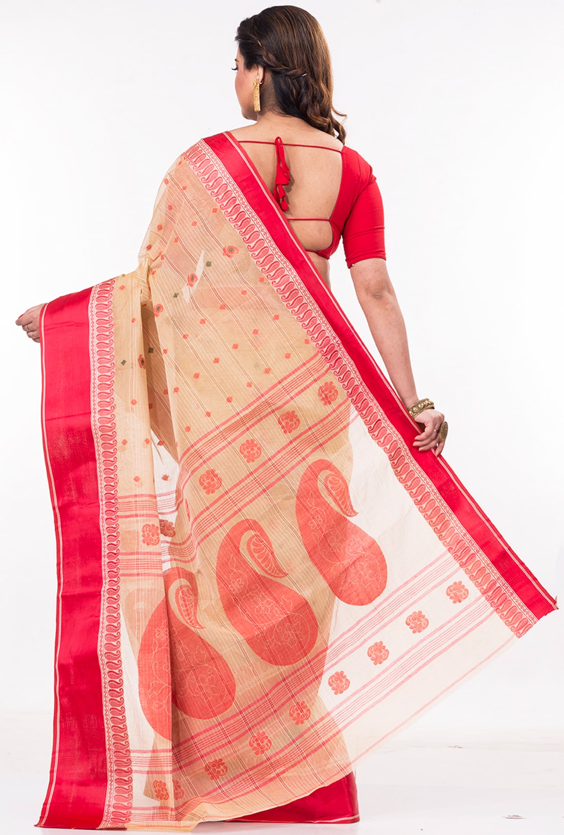 Handwoven red white Bengal Tant Tussar Silk saree with jamdani style pallu.