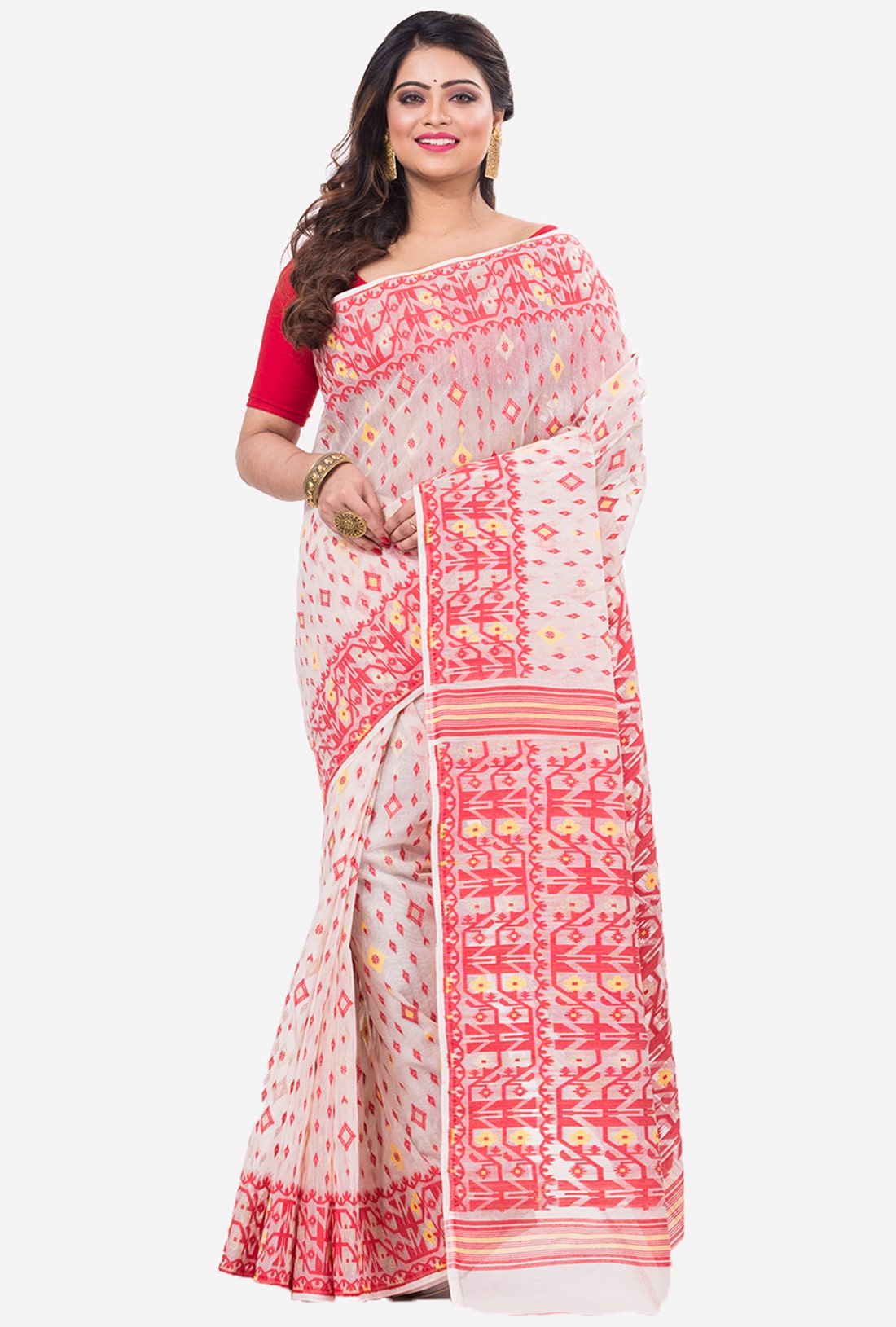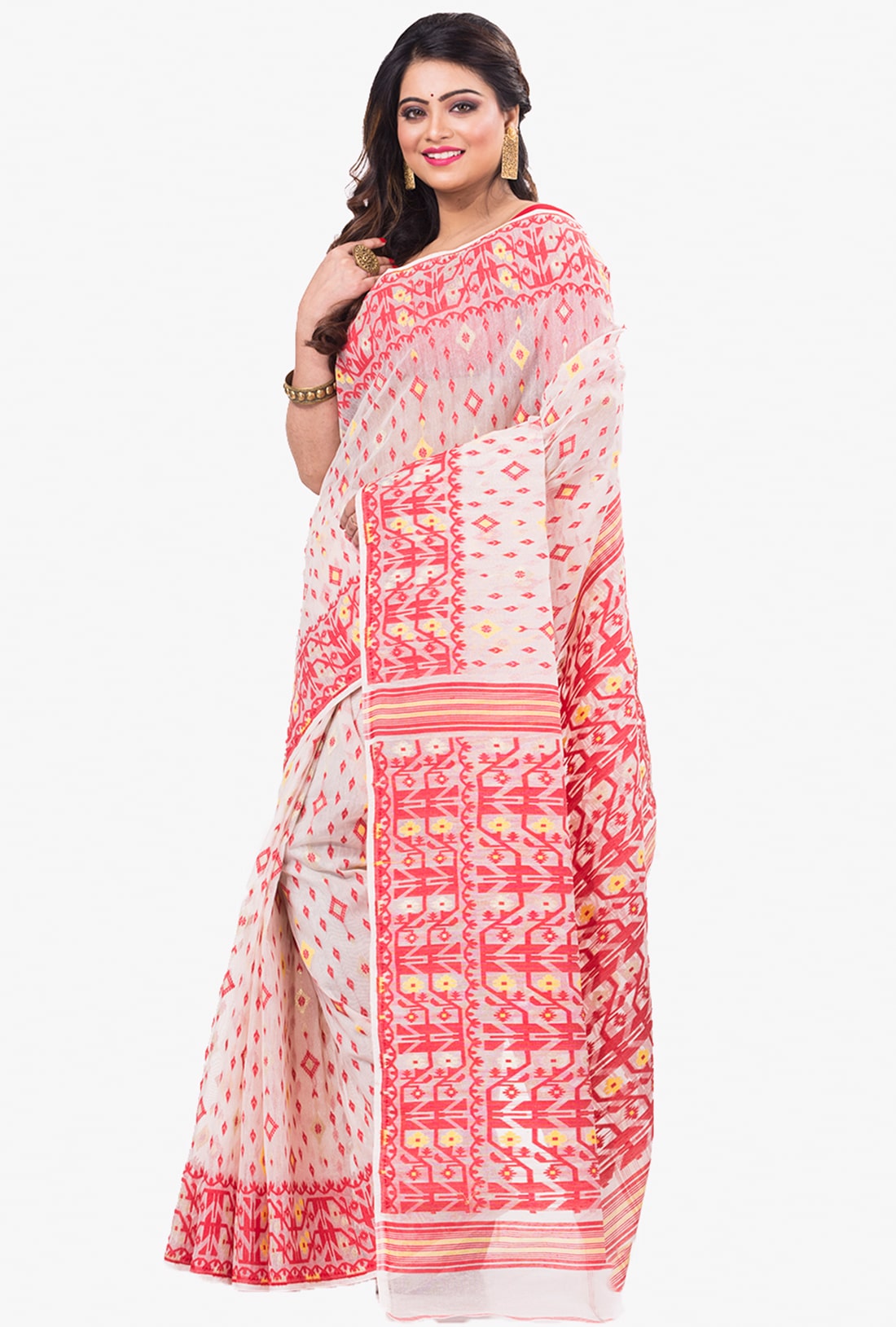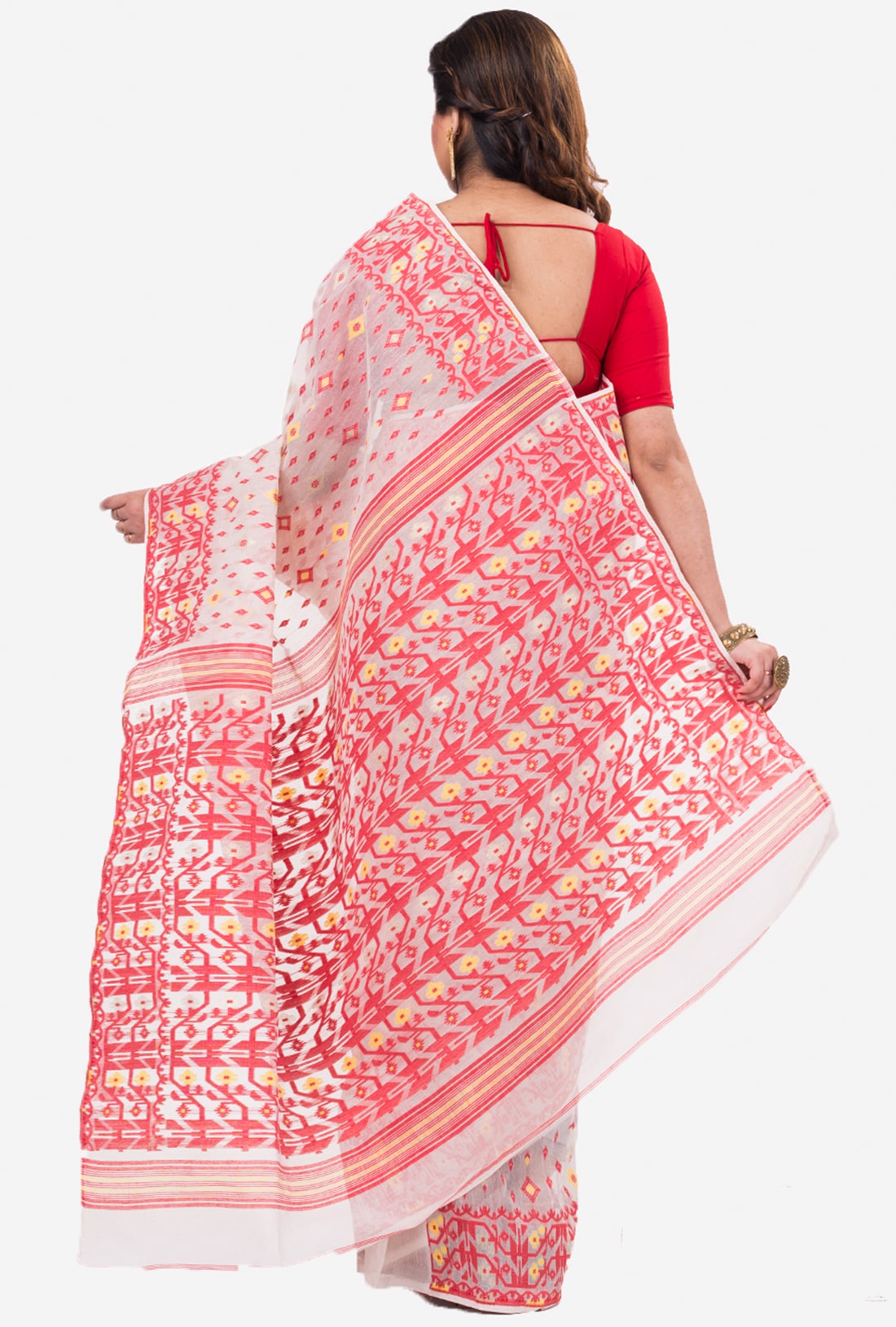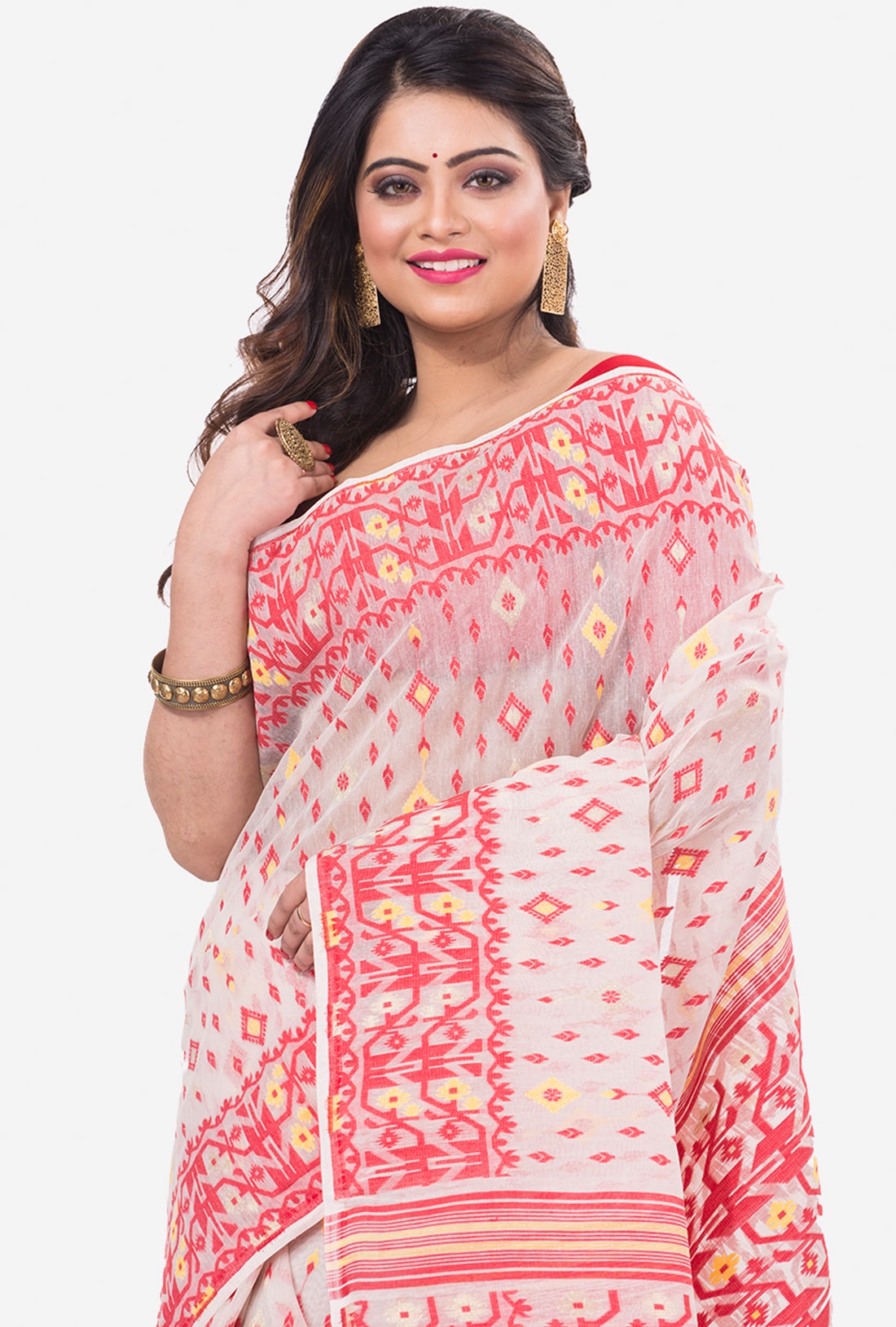 Handwoven red white Dhakai Jamdani saree with jamdani style pallu. The saree has all over weaving work.