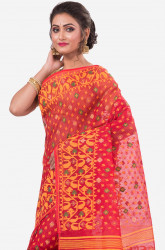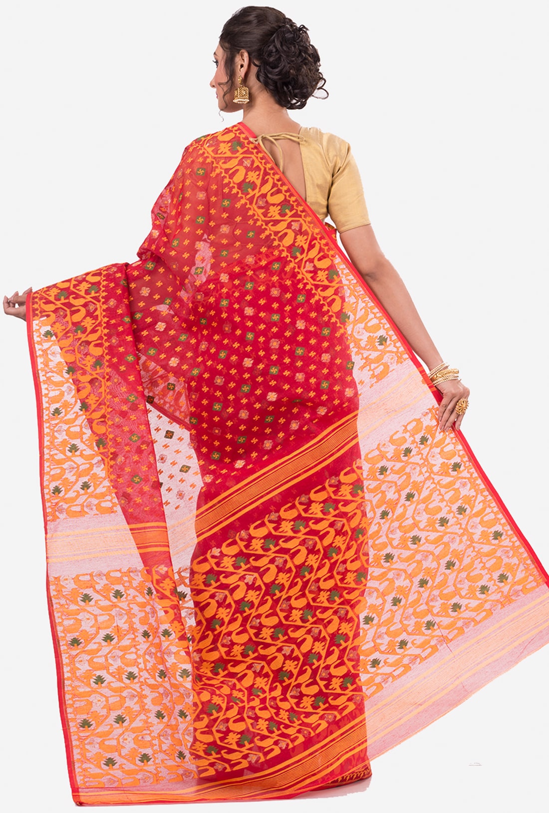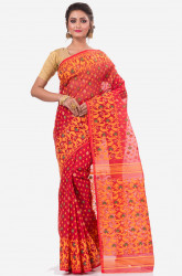 Red Yellow Dhakai Jamdani Handwoven saree with jamdani style pallu.