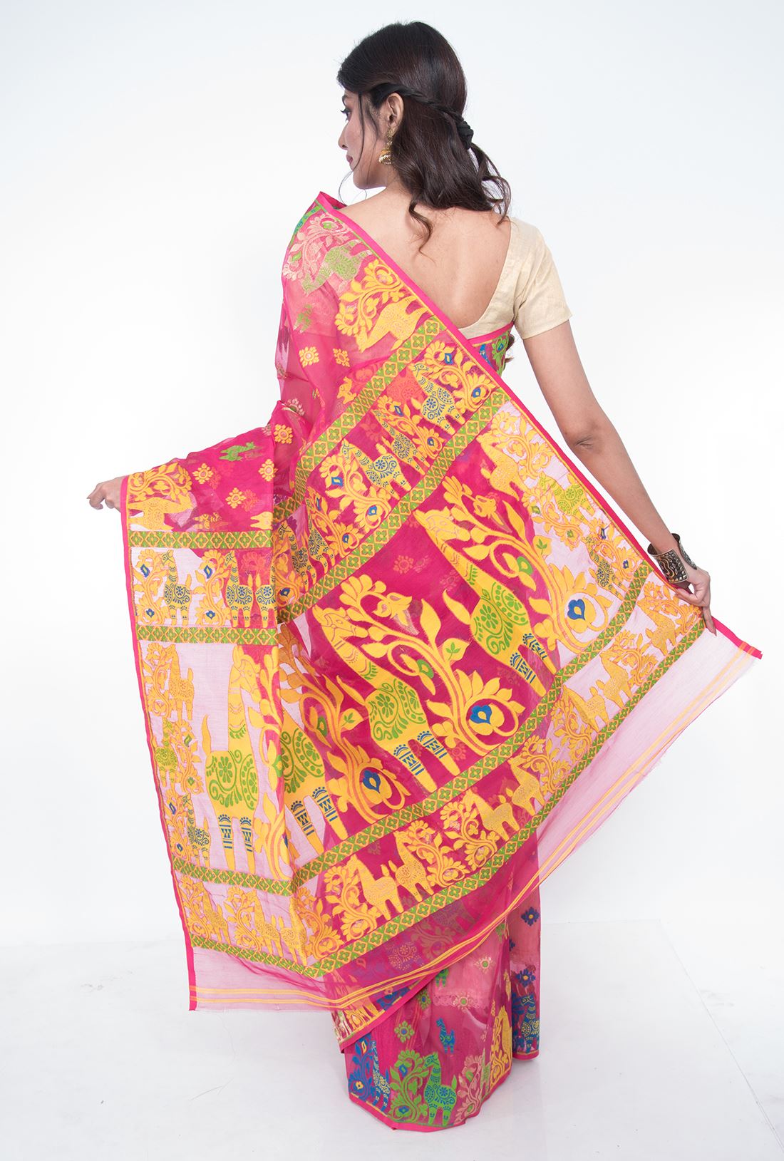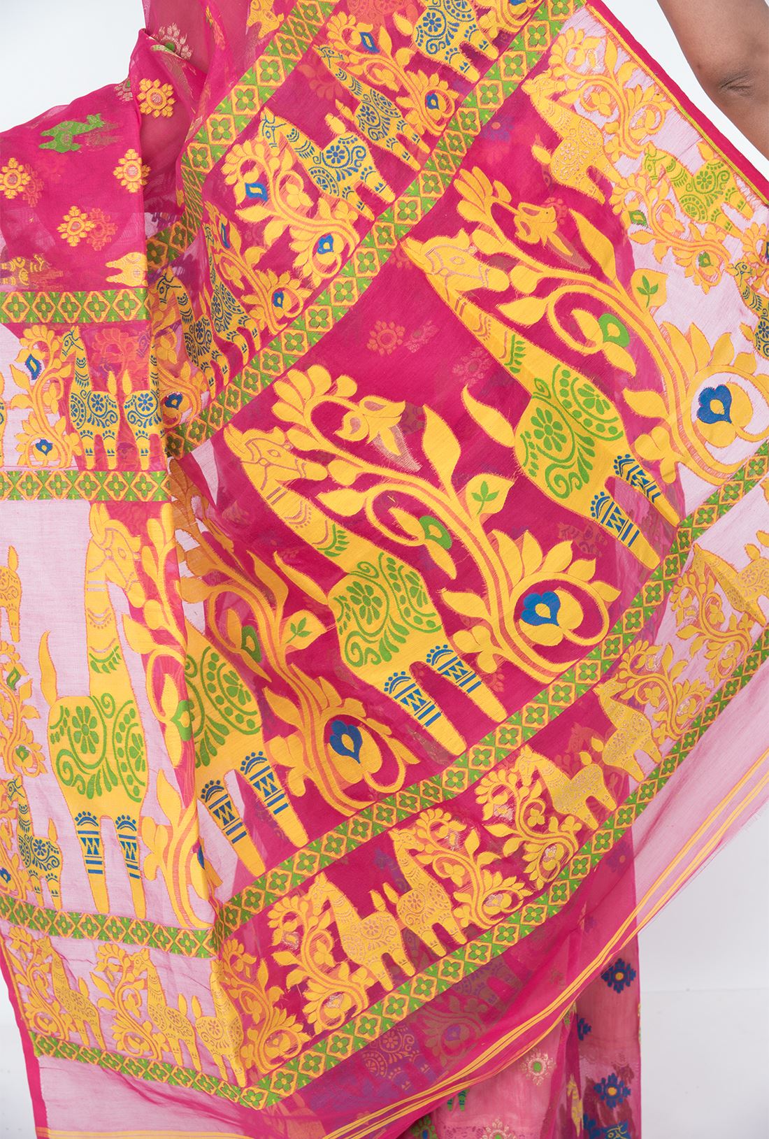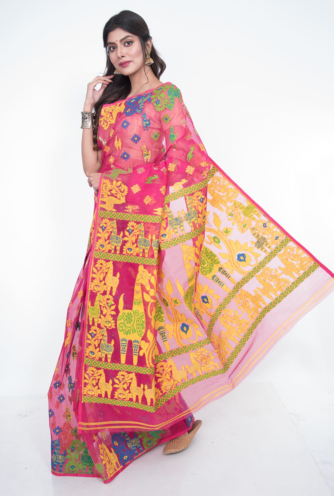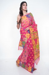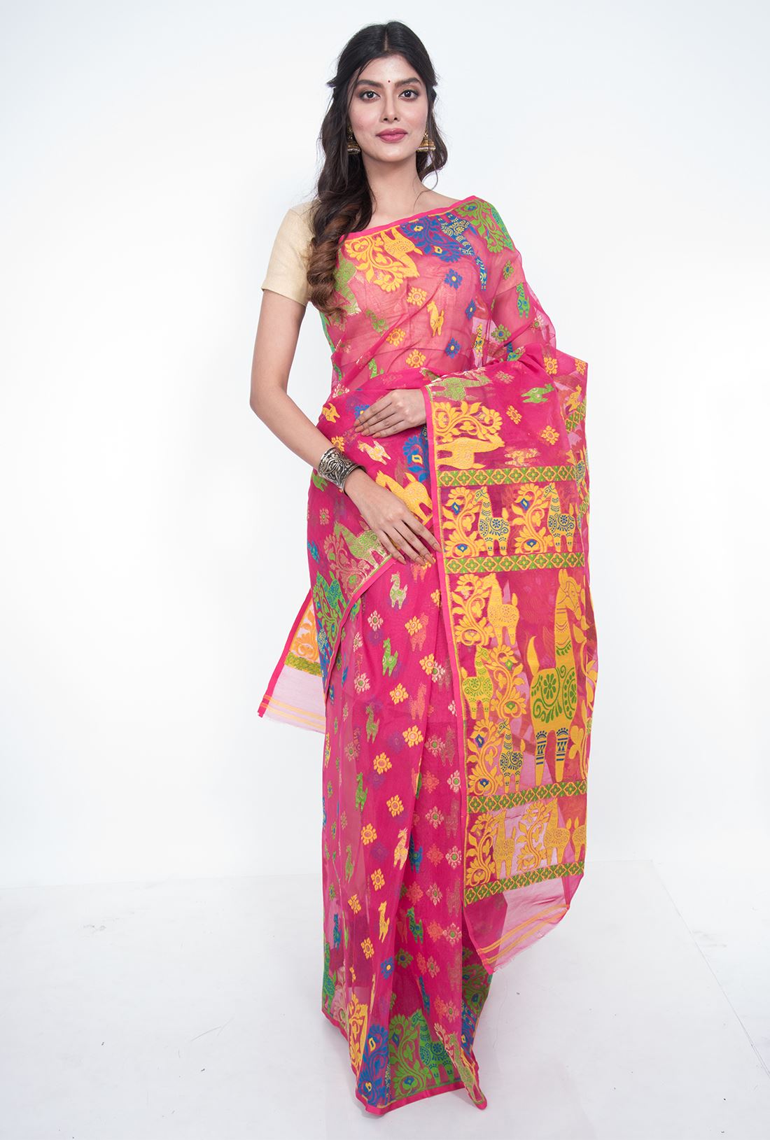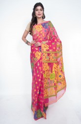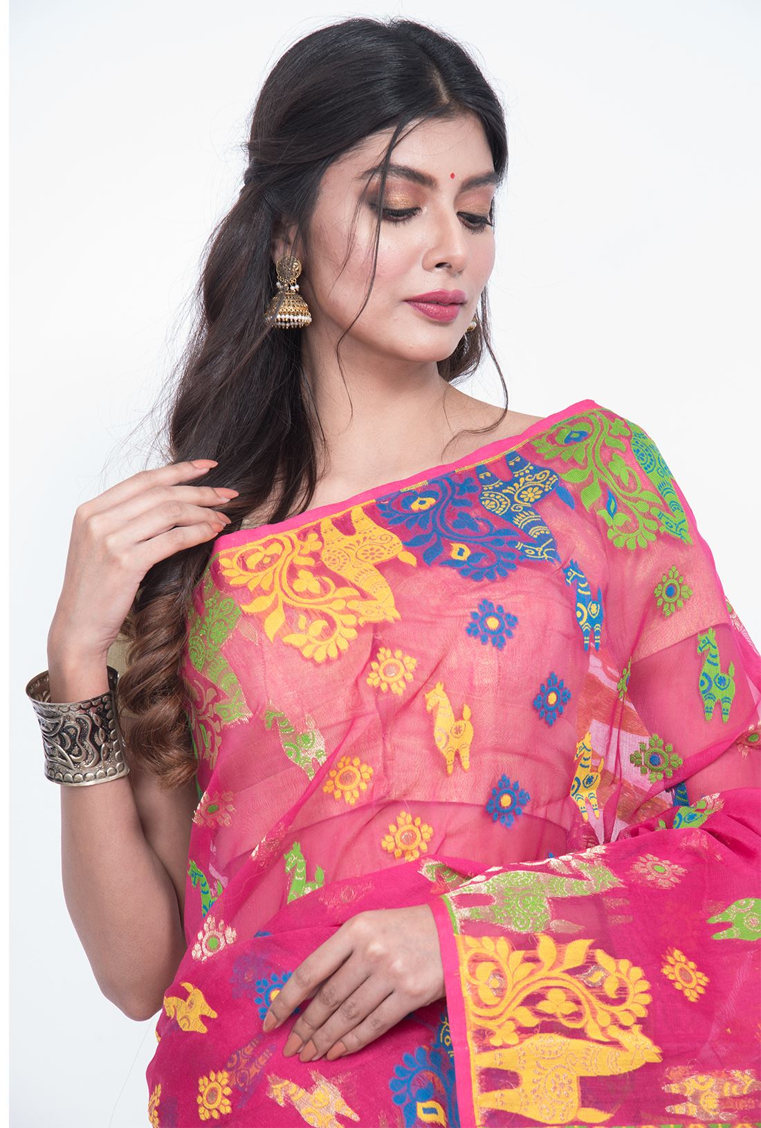 Body: Rose pink body with all over worked floral & animal jamdani buttas in multicolor.