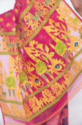 Border: Multicolor animal motis border on rose pink base draws from the pallav.