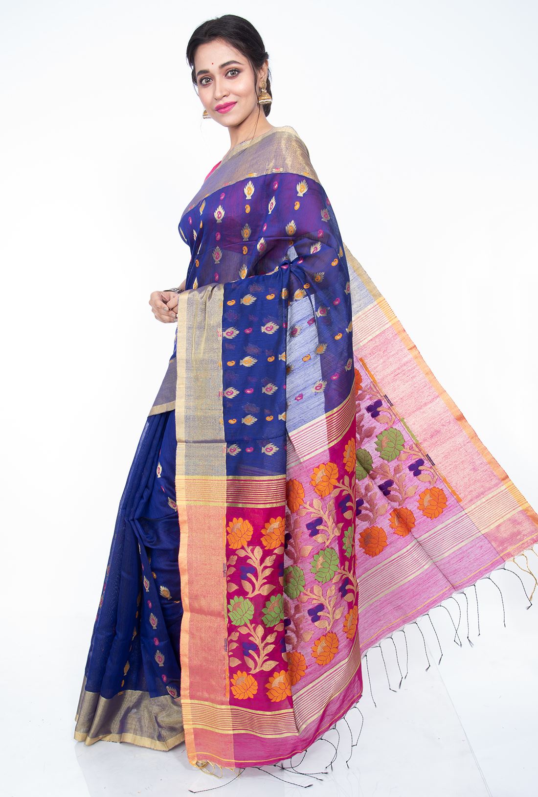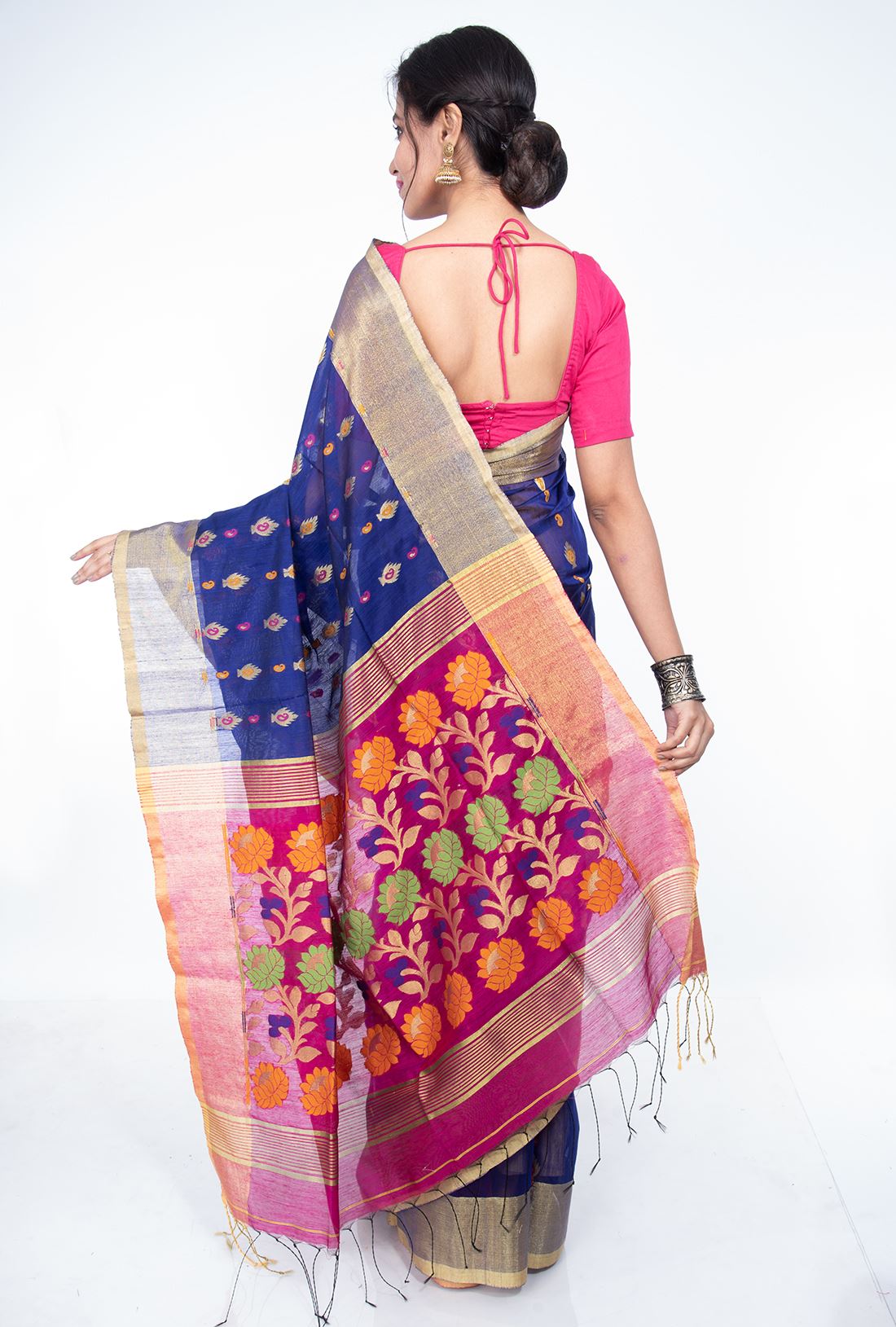 Pallav: Magenta Pink Pallav with lotus flower vine designs in golden copper, blue,orange and green, making an exquisite look.