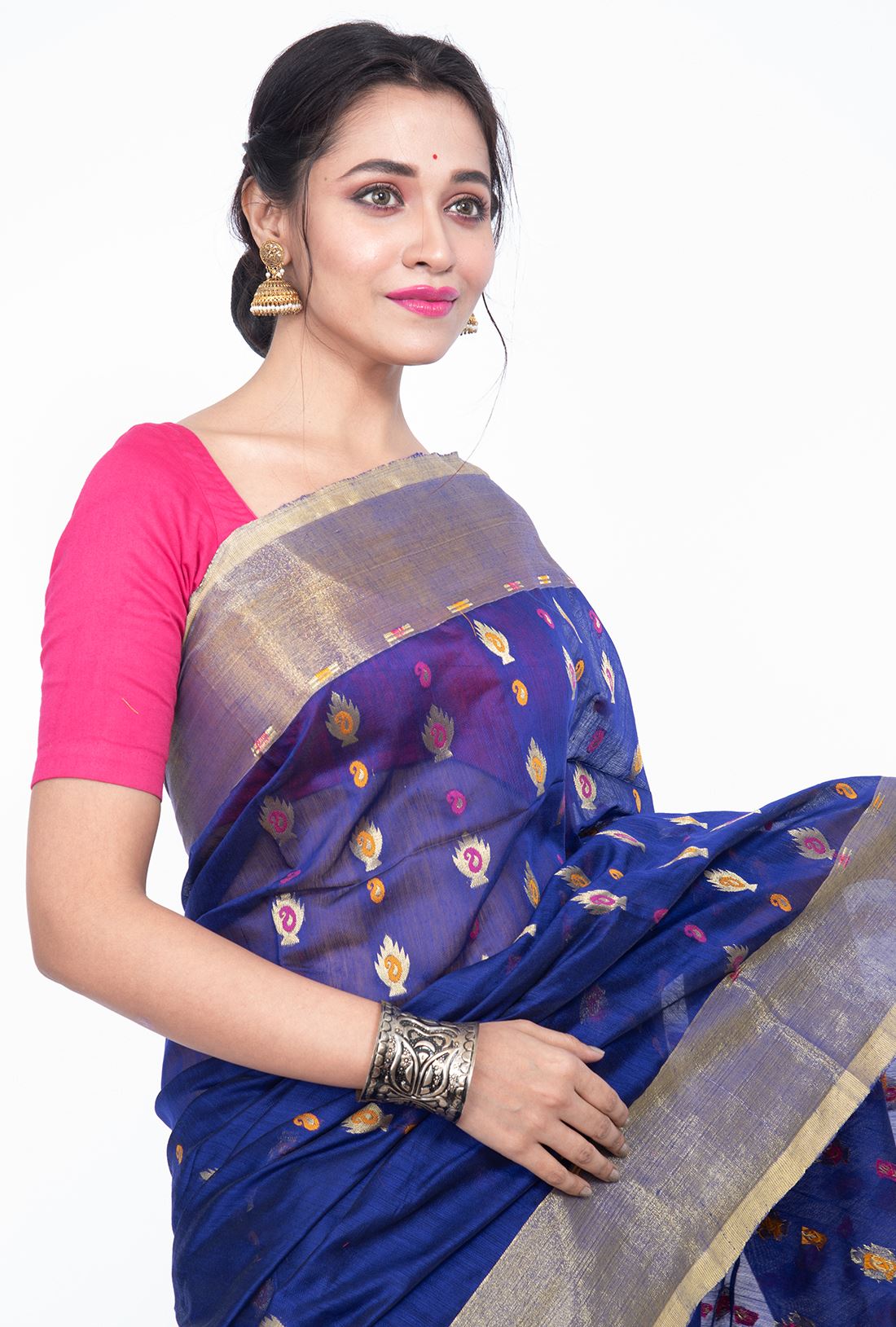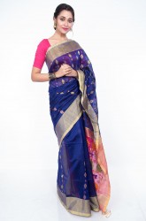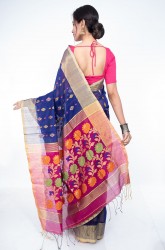 Body: Royal Blue body with small diamond shaped golden buttas with mango patterns in the centre in pink and orange.