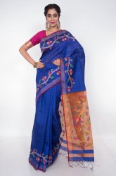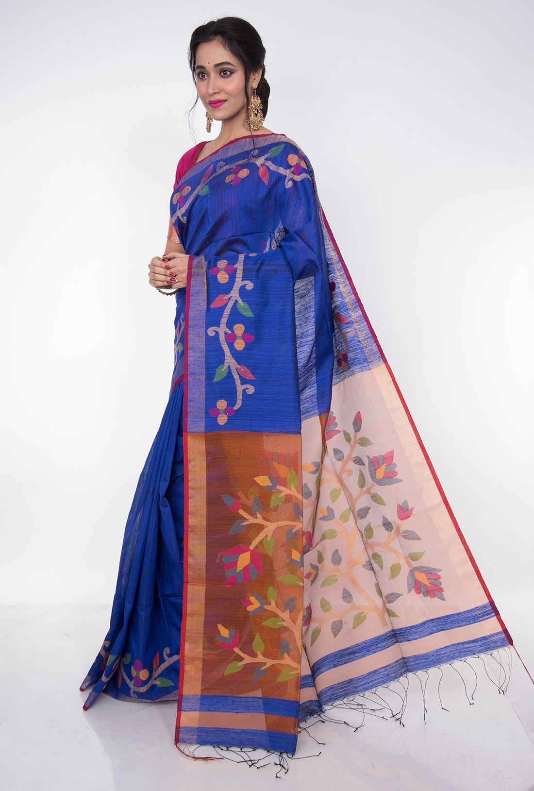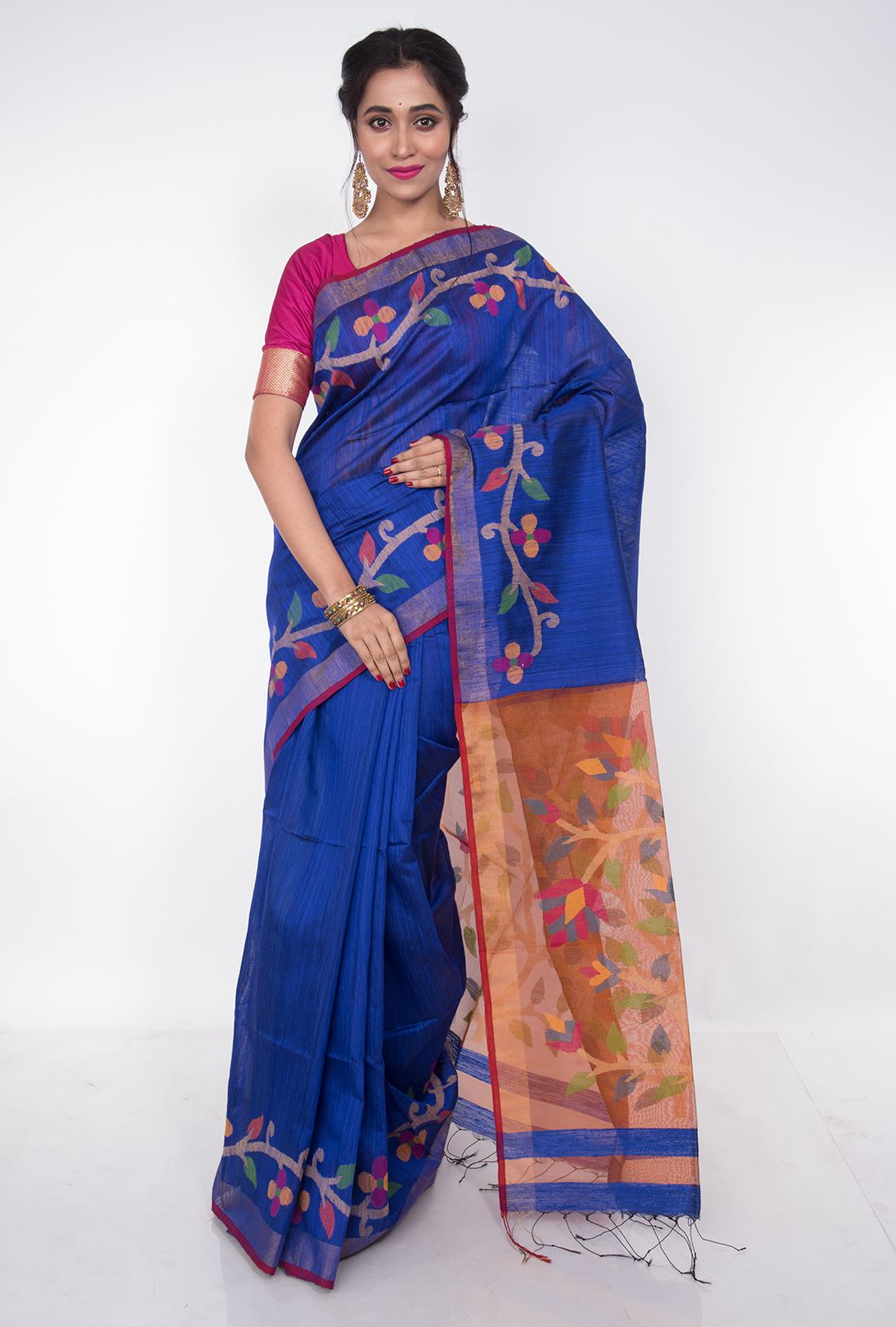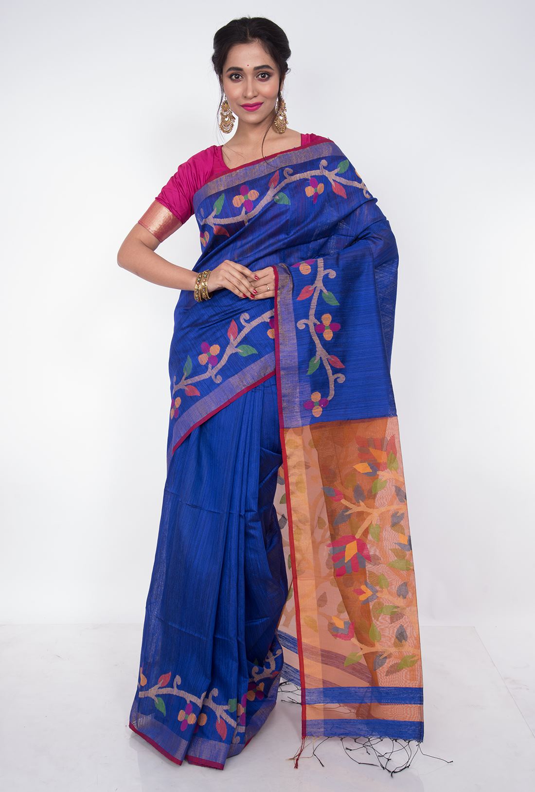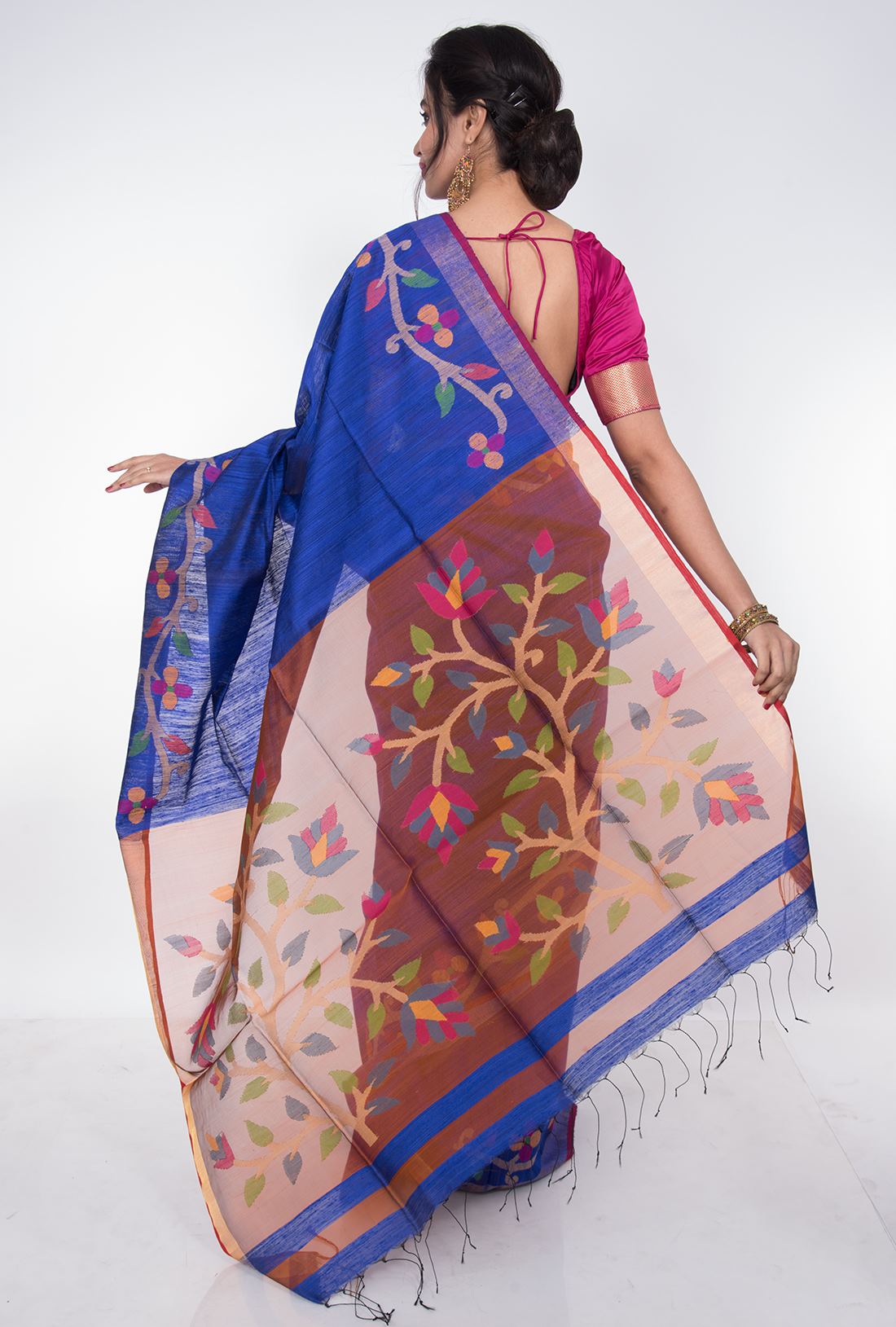Border: Handwoven Floral Jamdani work in multicolor draws from both side of the Pallav.