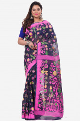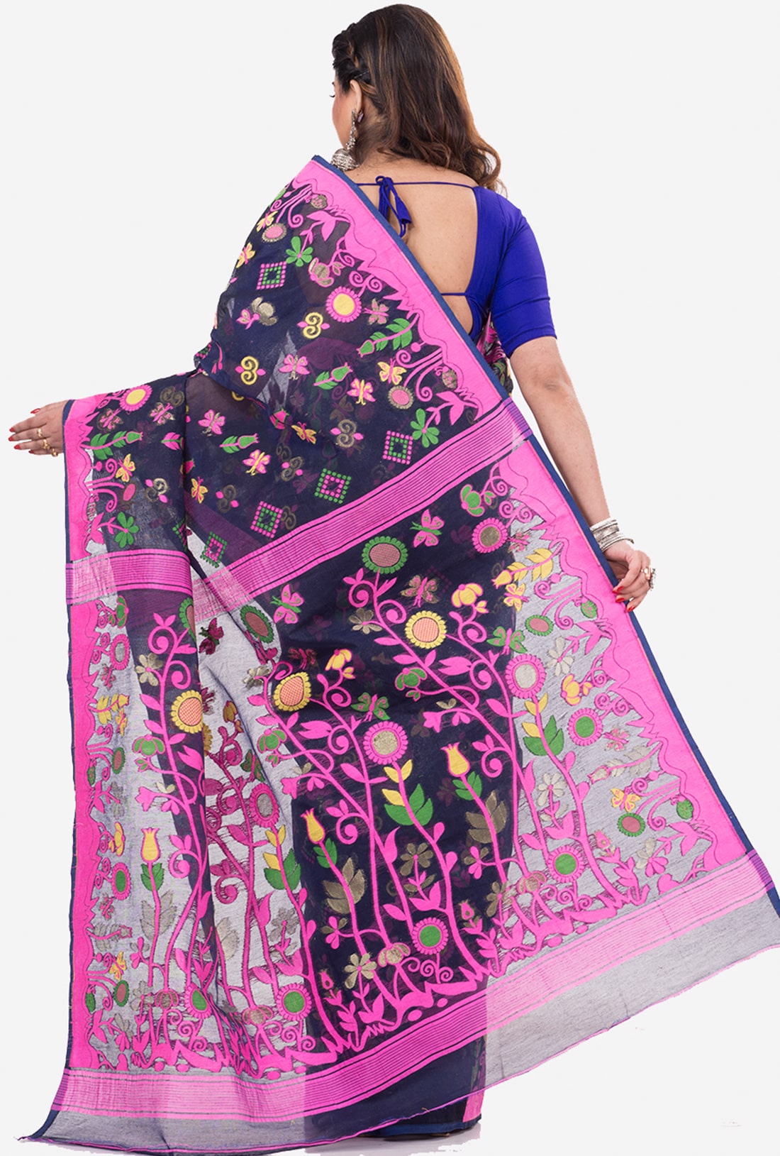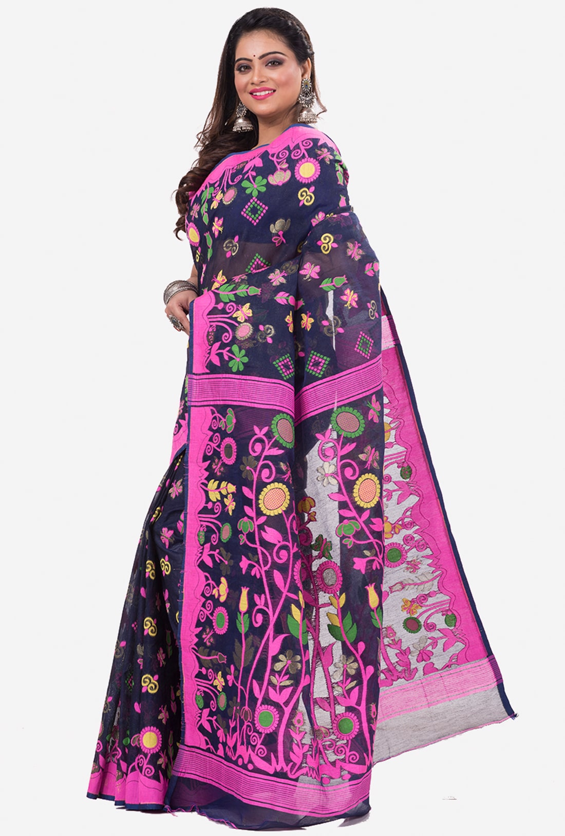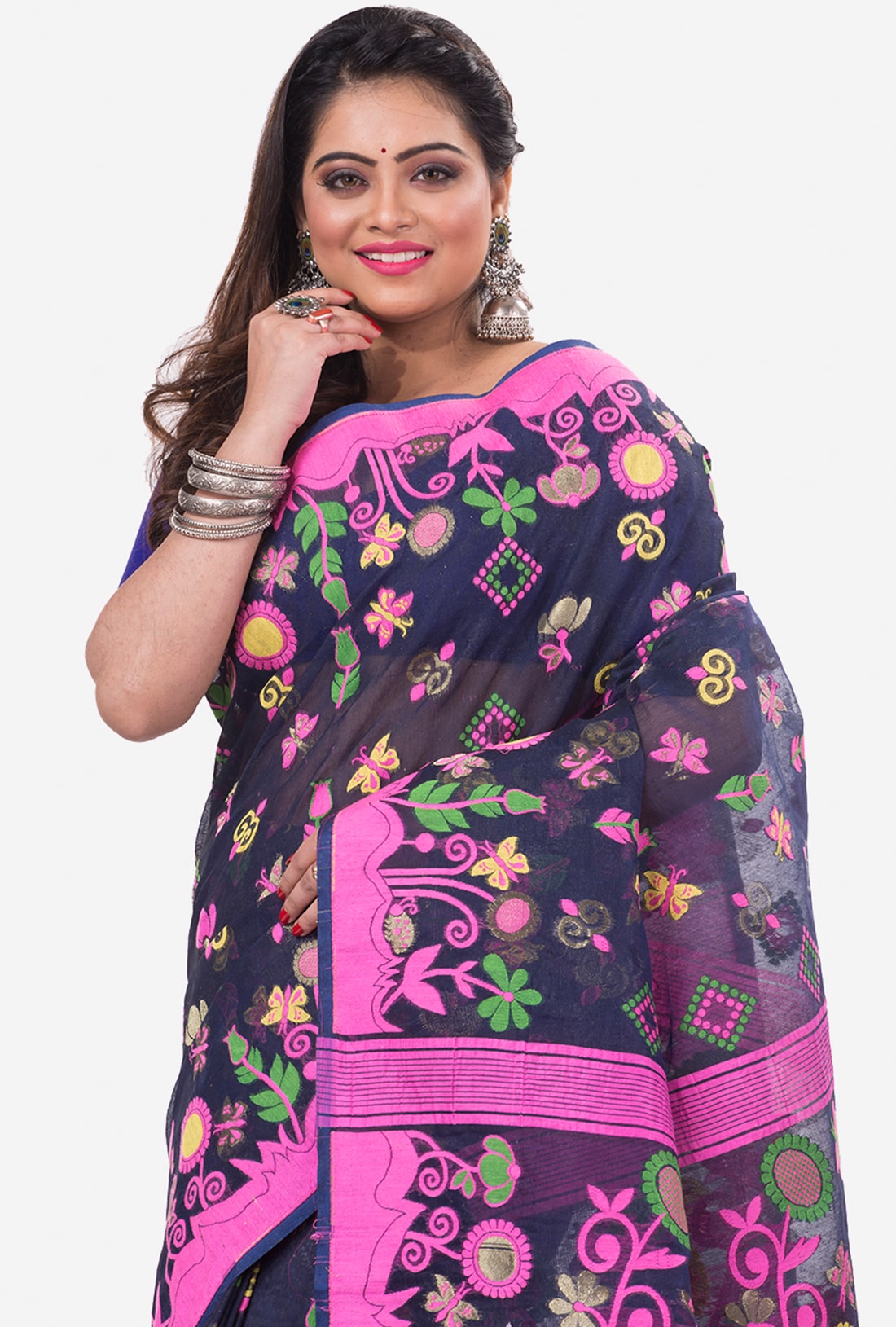 Royal Blue Pink Dhakai Jamdani Handwoven saree with jamdani style pallu.