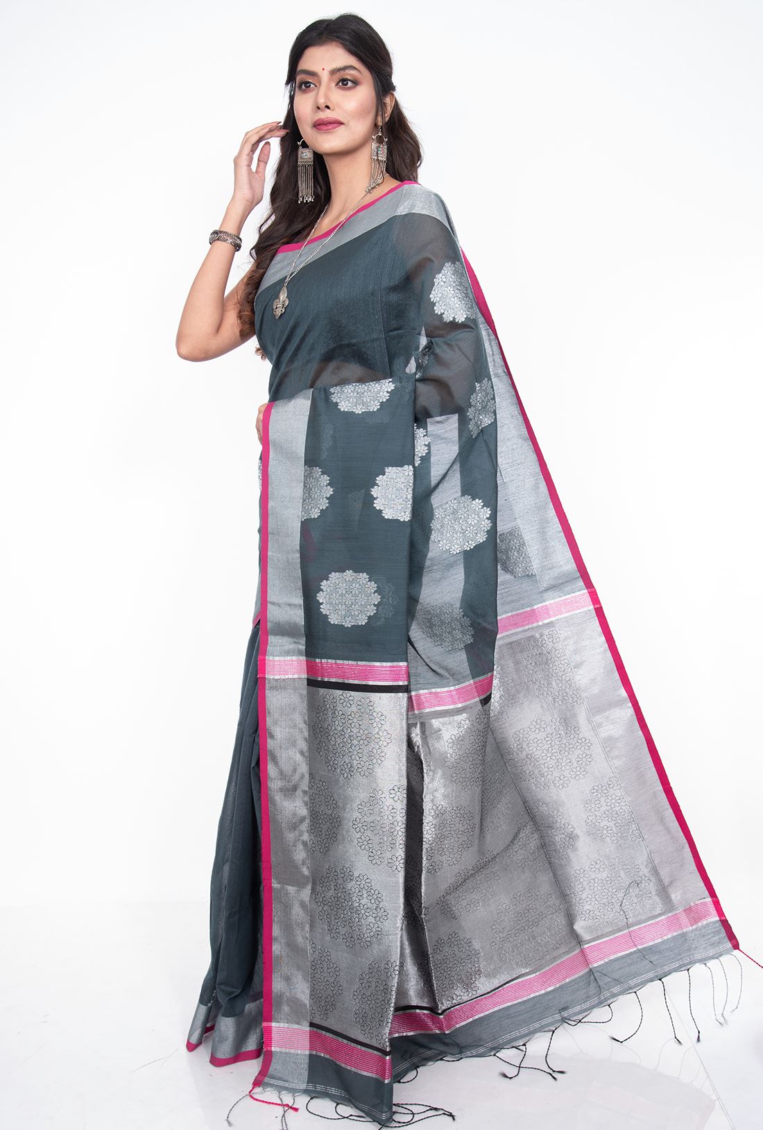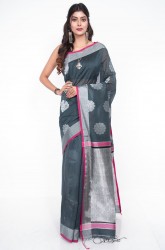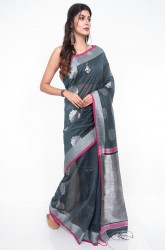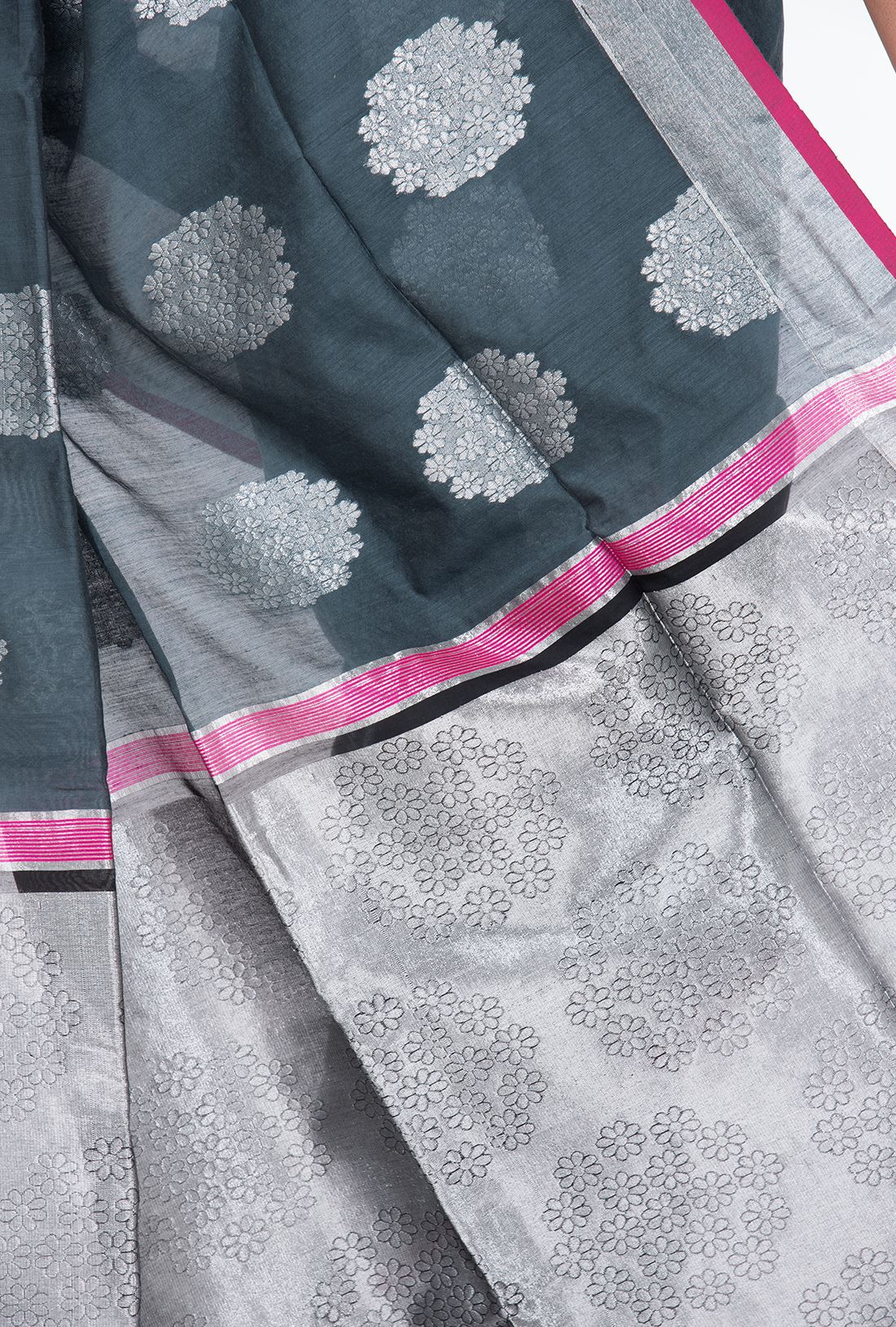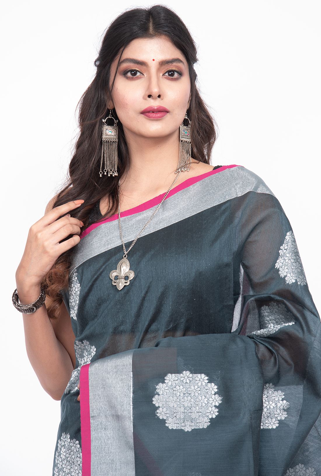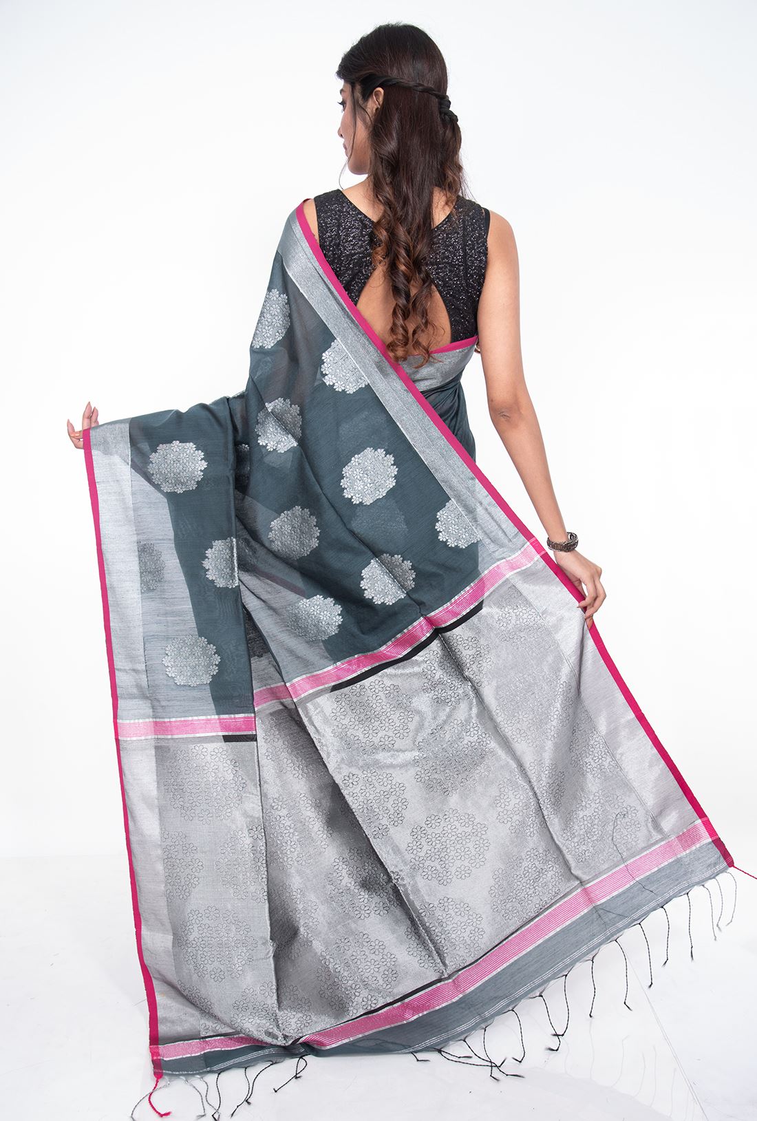Body: Gorgeous black body with round shaped floral motifs in silver zari throughout the body.