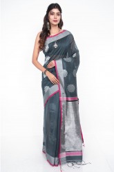 Border: Plain silver zari border with a narrow magenta pink beam on the edges draws from both side of the pallav.