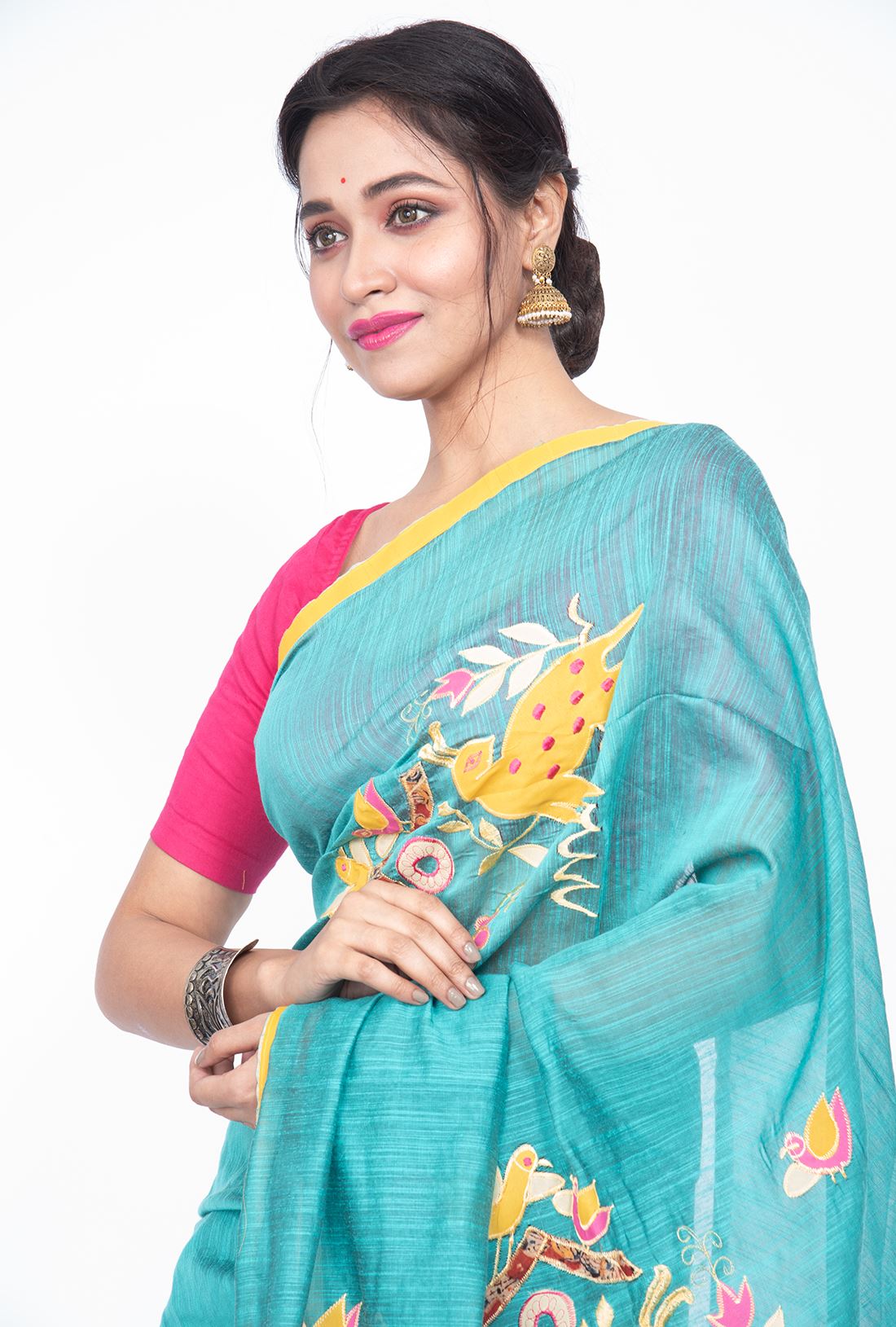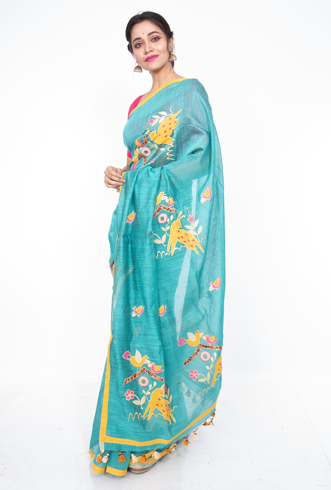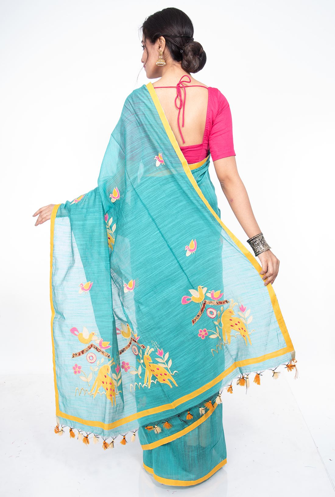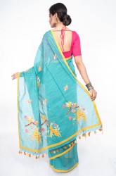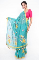 Pallav: Sky blue Pallav has animals & birds applique work in yellow , pink, white and kalamkari designs and has colorful jhalar at the ending side.