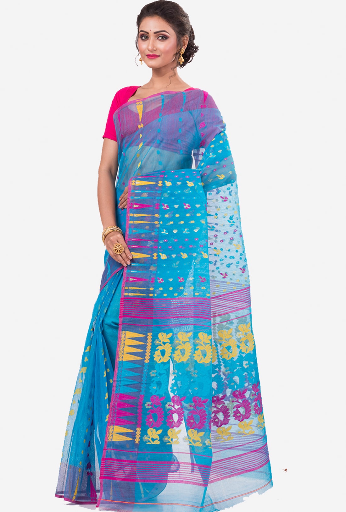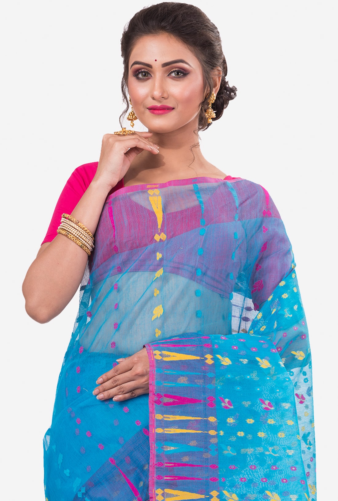 Turquoise Blue Dhakai Jamdani Handwoven saree with jamdani style pallu. The saree has all over weaving work.