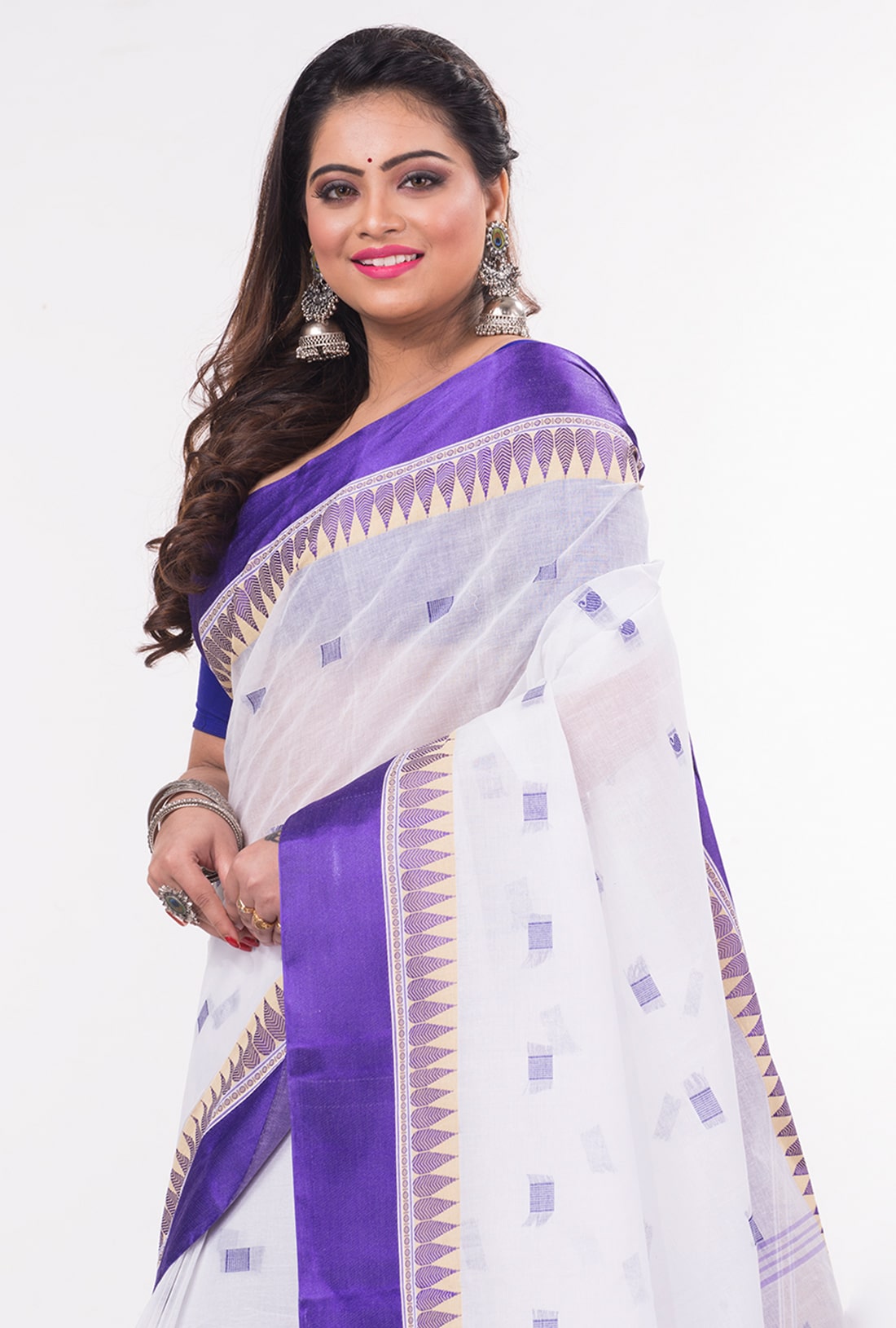 White Purple Handwoven Bengal Tant Cotton Saree with jamdani pallu.