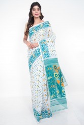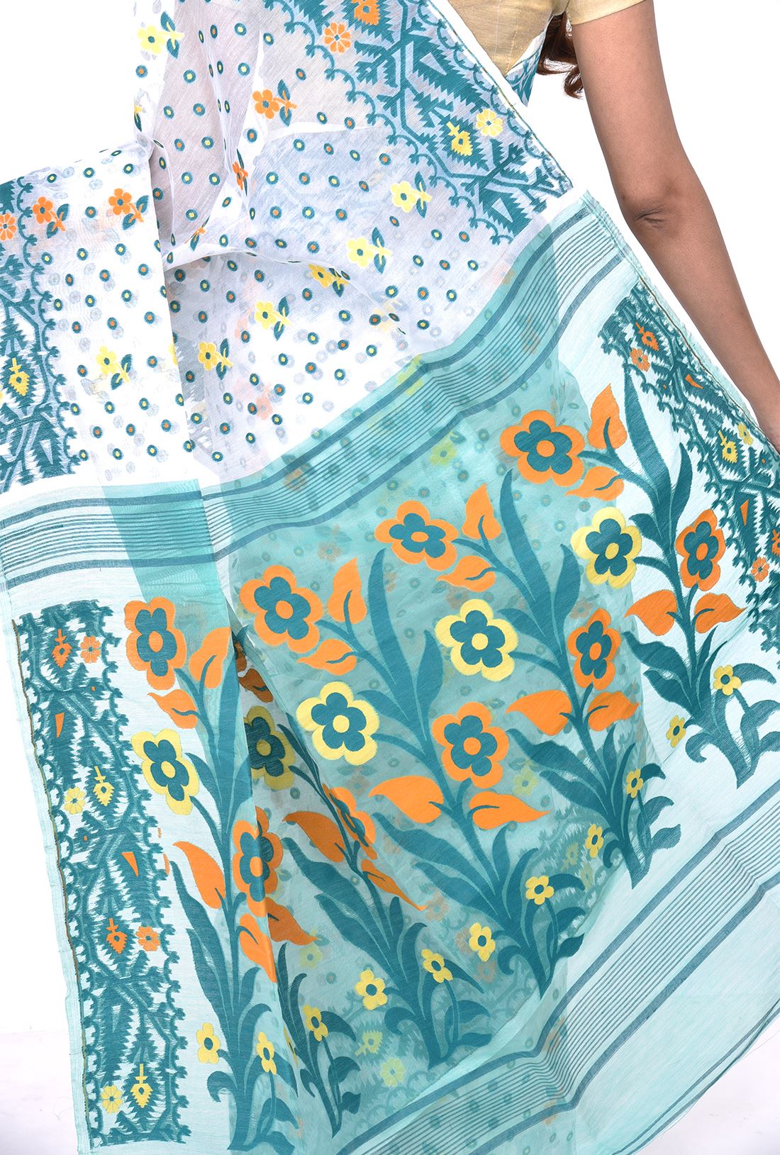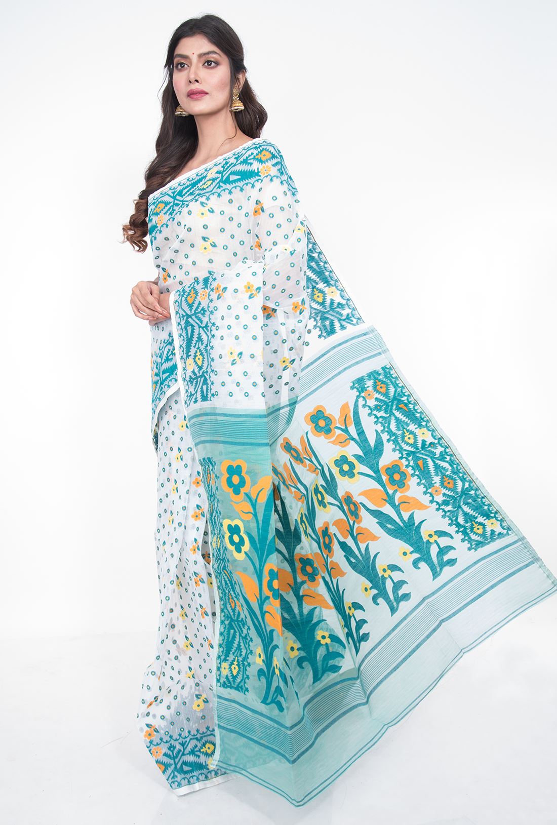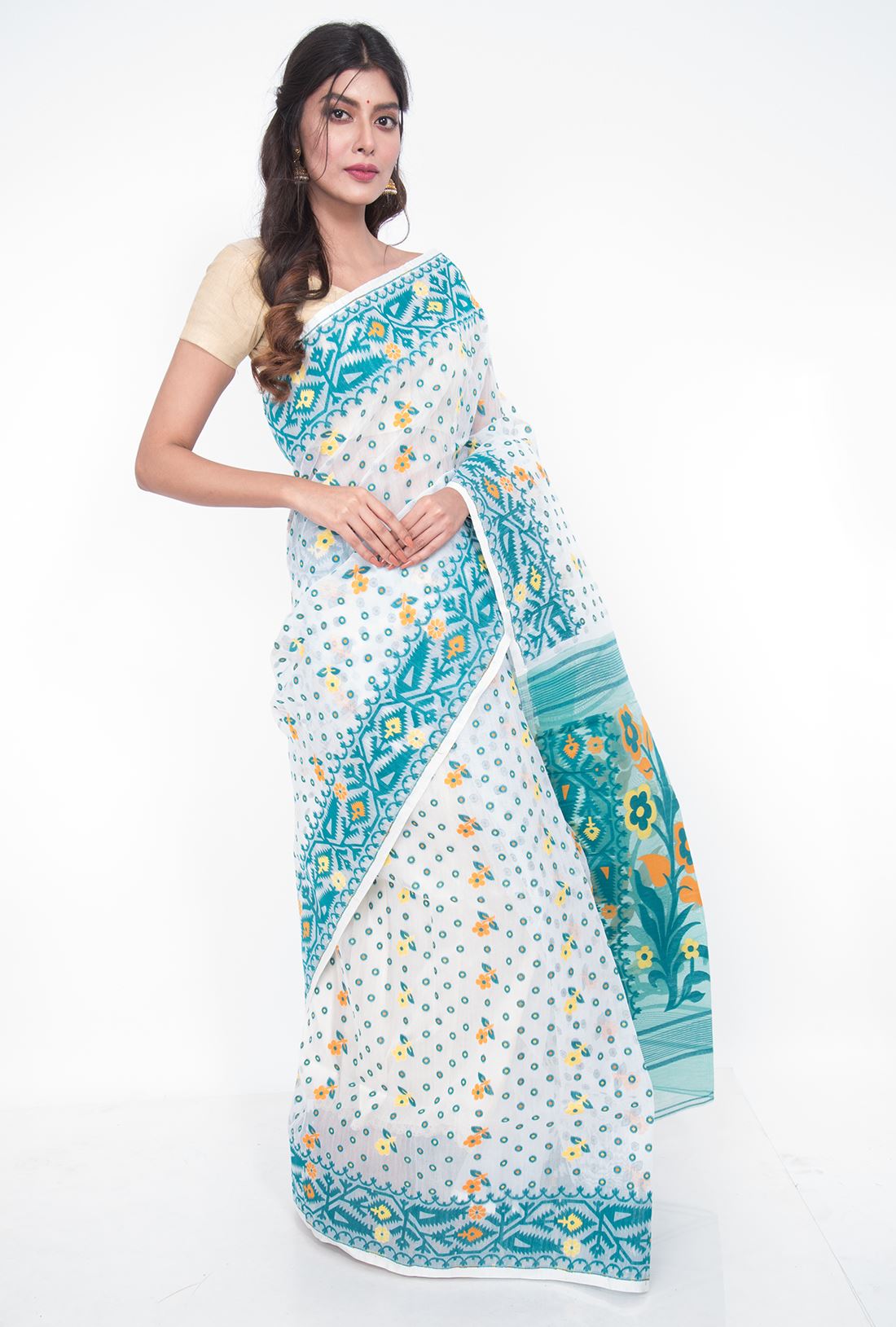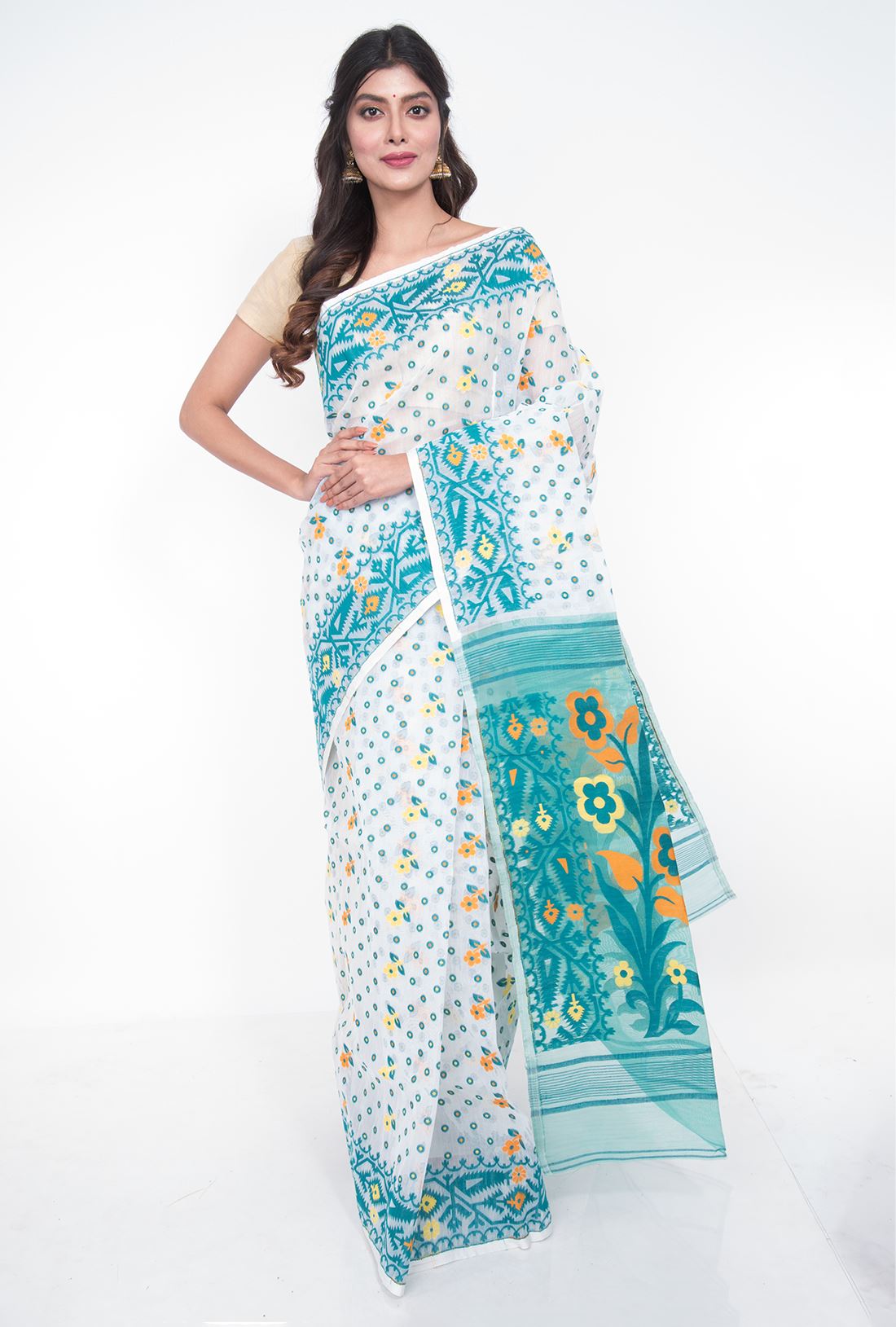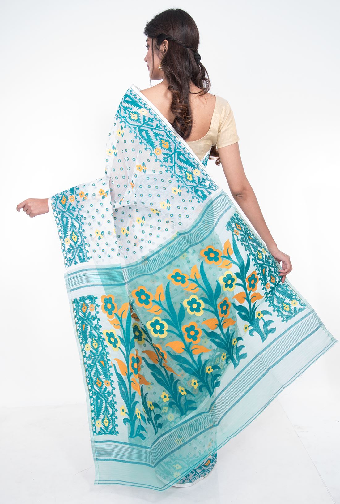 Body: White body with all over worked jamdani buttas in bright yellow and orange.