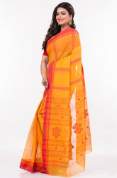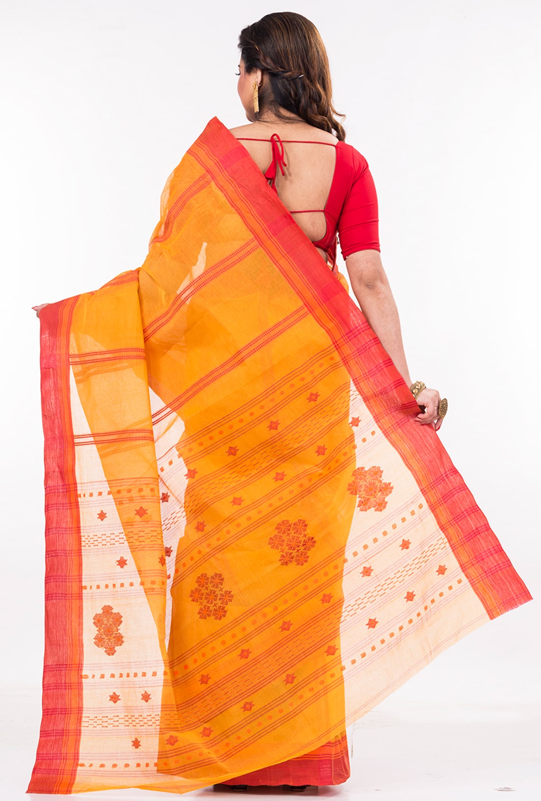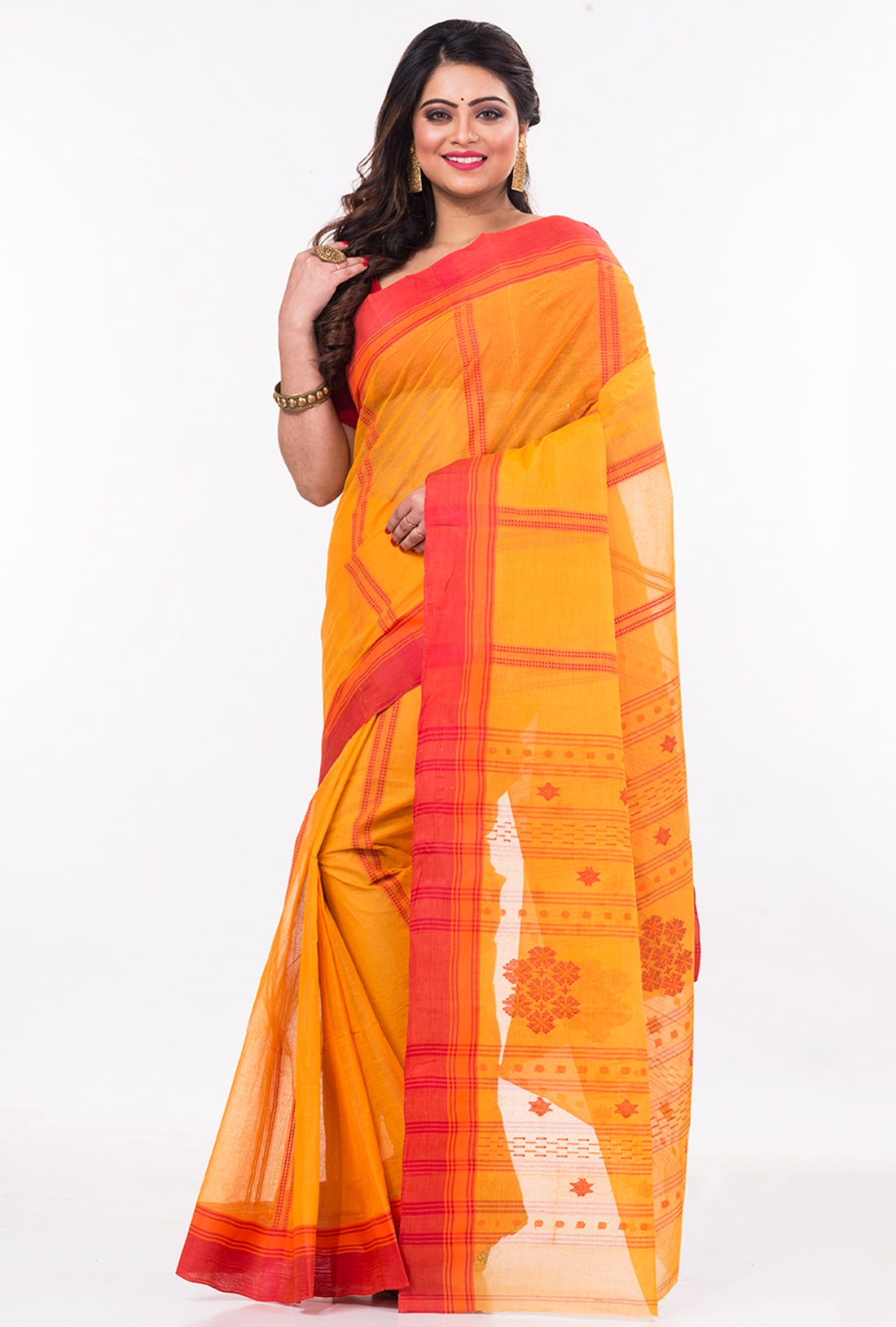 Handwoven yellow red Bengal Tant Cotton Saree with jamdani pallu.