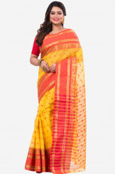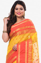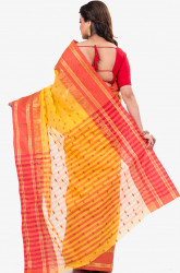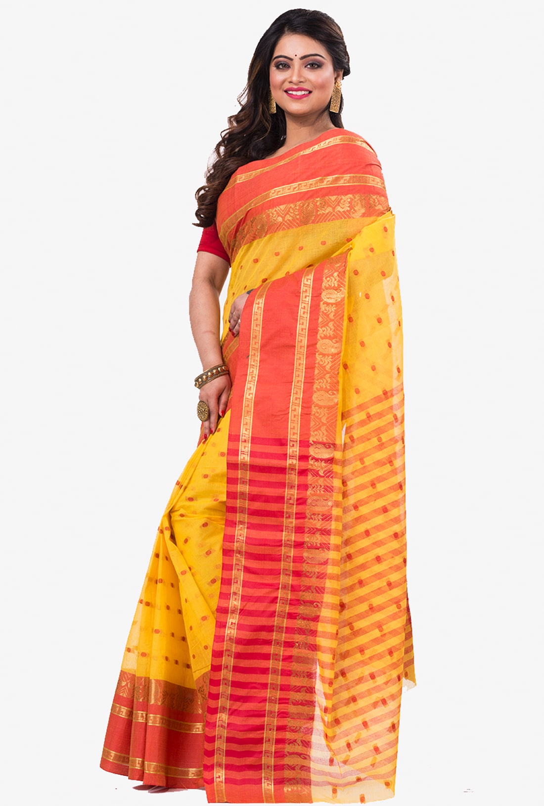 Handwoven yellow red Bengal Tant Cotton Saree with jamdani pallu.